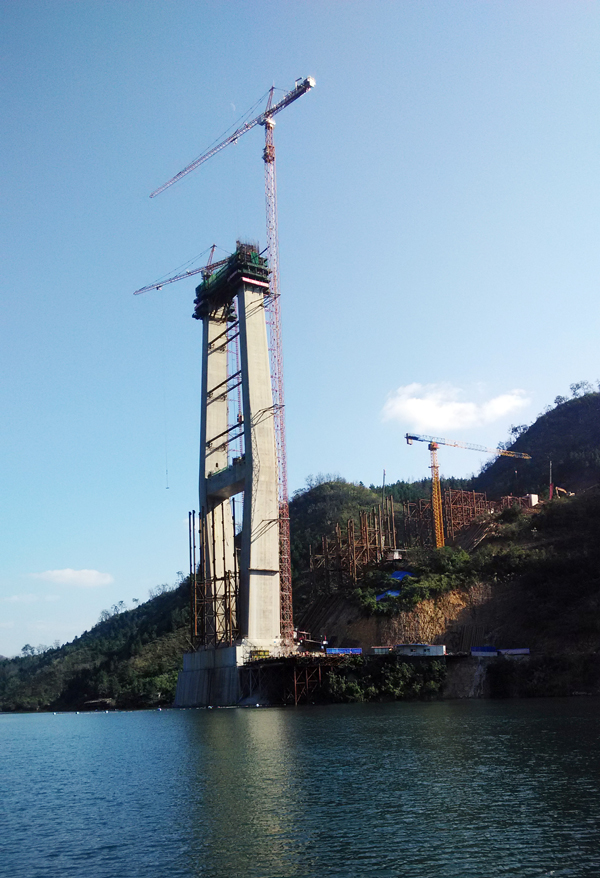 紅水河特大橋兩側(cè)橋墩高度均為210米,每個橋墩的起重機(jī)械配置均為川建生產(chǎn)的一臺C7036塔機(jī)、一臺C7030塔機(jī)和兩臺SC200/200WPZ中速變頻施工梯,副墩的施工機(jī)械為一臺P125平頭式塔機(jī)。 承擔(dān)主施工吊裝作業(yè)的C7036塔機(jī),最大起重量16噸,工作幅度為70米,C7030塔機(jī)最大起重量16噸,起升高度為220米,工作幅度為50米,兩臺塔機(jī)交叉式布置,覆蓋面大,C7036塔身斷面2.5米,主弦為圓鋼,C7030塔身斷面2米,主弦為角鋼,機(jī)構(gòu)配置均采用變頻無級調(diào)速系統(tǒng),啟動、制動平穩(wěn)。
